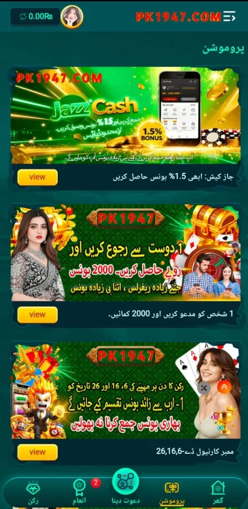 Moreover the most important bonus that the game offers is the referral bonus which strongly boosts user earnings. Because of these multiple bonuses users continue to join this game, and the app is becoming more popular. Furthermore for user convenience multiple games are available on a single platform. Therefore players do not need to go anywhere else for other games. In this app the most popular games aviator, ludo, roulette, card games, fishing games, slot machines, and many sub category games are also available.