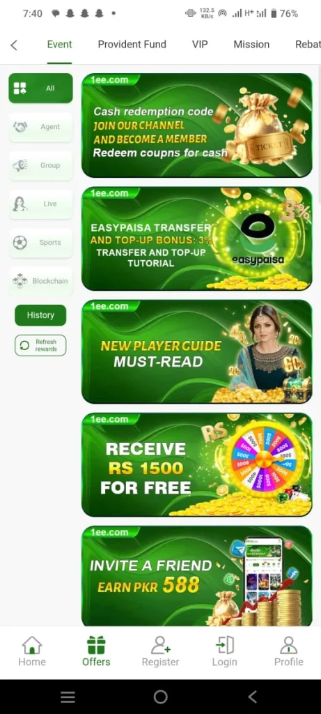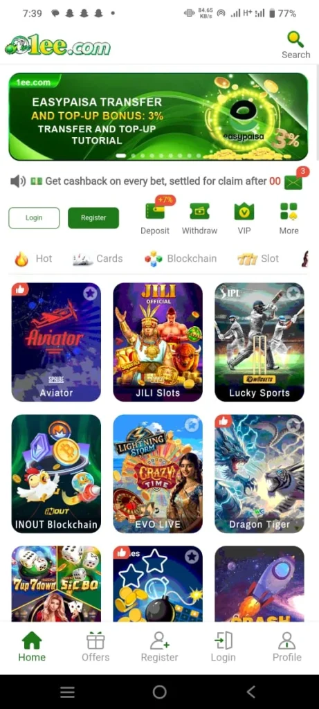 1EE Game is a casino style game that allows you to earn a good income from home with just a small investment. It provides all its users with money without any stress making it a trustworthy option for players. Moreover this game serves as a new and exciting platform for online gaming lovers where your earning journey begins right away. inside the game you will find numerous features and a wide variety of games.