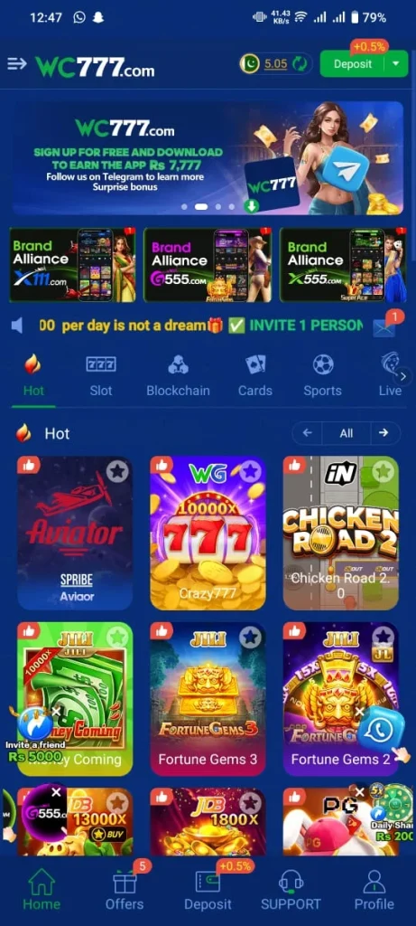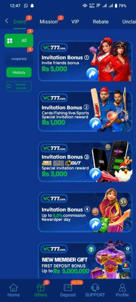 WC 777 Game download Free For android new version 2025 game also offers a referral plan. You can share your referral link with others and earn good rewards in the form of referral bonuses. If you face any issues or need information about the game you can contact the support centre. Their support team is available 24/7 to help you. so stop sitting idle and worrying download this game now turn it into your source of income and make the most of all the offers provided by the platform.