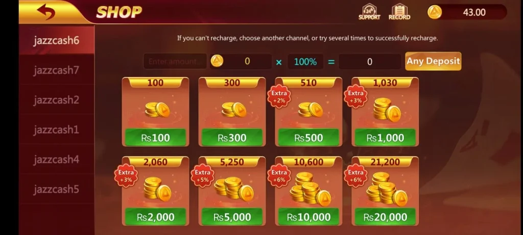 This game offers you multiple payment methods. You can choose any wallet of your choice and make a deposit using easypaisa, jazzcash or bank transfer.